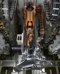 按照寶馬公司的要求,把五六臺伺服直接驅動的壓力機連接到一起,長度約有85米。沖壓成型第一步,下料機把特制的薄板放到生產線上,然后再有舒勒提供的機器人傳輸到下一個壓力機上,壓力機生產線的沖壓能力可達9000噸,經過六次工藝,金屬薄板(厚度為2.5mm)會被拉伸、彎曲、沖裁而形成所需的車身造型。該壓力機每天可以加工600噸鋼鐵--相當于柏林著名的廣播發射塔的重量。圖為自動化橫桿送料機器人把坯料從一個工作臺送到下一個工作臺。