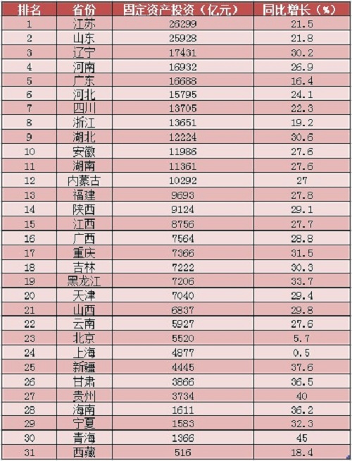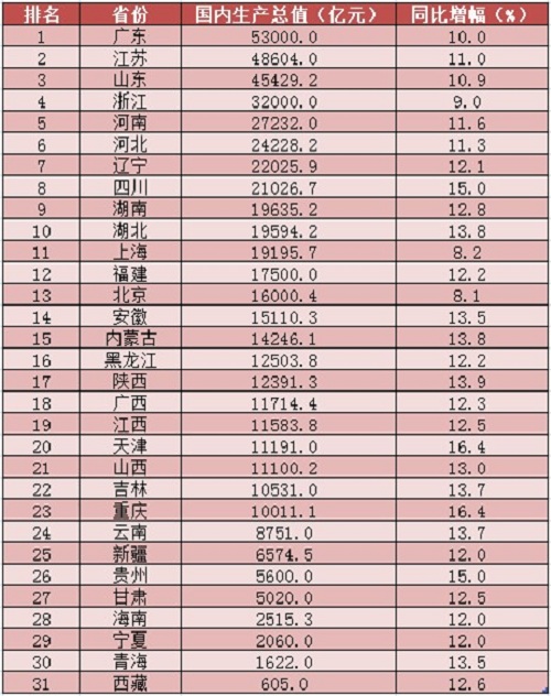 一、國內(nèi)區(qū)域經(jīng)濟(jì)發(fā)展形勢概覽 作為一個(gè)發(fā)展中國家,2011年中國經(jīng)濟(jì)取得進(jìn)步與發(fā)展,經(jīng)濟(jì)總量超越日本,成為全球第二,而人均GDP反映出我國雖已是經(jīng)濟(jì)大國,但并非是經(jīng)濟(jì)強(qiáng)國。2011年全年國內(nèi)生產(chǎn)總值(GDP)為471564億元,比上年增長9.2%,其中廣東、江蘇和山東位居全國前三甲,2011全球主要經(jīng)濟(jì)體GDP數(shù)據(jù)以及國內(nèi)各省級行政區(qū)GDP數(shù)據(jù)見表1及表2;全年全社會固定資產(chǎn)投資311022億元,比上年增長23.6%,其中江蘇、山東和遼寧固定資產(chǎn)投資位居前三,國內(nèi)各省級行政區(qū)固定資產(chǎn)投資詳細(xì)見表3。 表1 2011年世界主要經(jīng)濟(jì)體GDP數(shù)據(jù)
