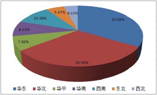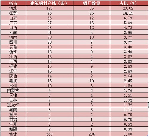 圖1各區(qū)域建筑鋼材產(chǎn)線占比 從各區(qū)域來看,全國有超過六成建筑鋼材產(chǎn)線位于華東和華北區(qū)域,其中華東六省江蘇、山東、浙江、安徽、江西和福建67家鋼廠共擁有建筑鋼材產(chǎn)線178條,占產(chǎn)線總數(shù)的33.58%;華北區(qū)域河北、山西、天津和內(nèi)蒙古56家鋼廠共擁有建筑鋼材產(chǎn)線164條,占產(chǎn)線總數(shù)的30.94%;西南、華南、華中、東北和西北分別以10.38%、8.11%、7.36%、5.47%和4.15%的占比位居其后。這說明中國鋼鐵生產(chǎn)高度集中于華東和華北區(qū)域。 表4 國內(nèi)各省市建筑鋼材產(chǎn)線分布