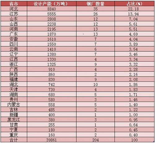 圖2 各區(qū)域建筑鋼材產(chǎn)能占比 與產(chǎn)線分布情況類似,全國有六成以上建筑鋼材產(chǎn)能來自于華東和華北區(qū)域,其中華東六省江蘇、山東、浙江、安徽、江西和福建67家鋼廠建筑鋼材設(shè)計(jì)產(chǎn)能共13458萬噸,占產(chǎn)能總數(shù)的33.76%;華北區(qū)域河北、山西、天津和內(nèi)蒙古56家鋼廠建筑鋼材設(shè)計(jì)產(chǎn)能共12366萬噸,占產(chǎn)能總數(shù)的31.02%;西南、華中、華南、東北和西北分別以9.28%、9.07%、6.97%、5.63%和4.25%的占比位居其后。 表5 國內(nèi)各省市建筑鋼材產(chǎn)能分布