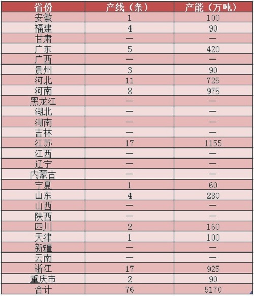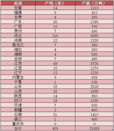 從上表可以看出,全國各省市中擁有建筑鋼材數(shù)量位居前三的河北、江蘇和山東均是來自于中國鋼鐵生產(chǎn)較為集中的華東和華北區(qū)域。其中,河北省35家鋼廠共擁有122條建筑鋼材產(chǎn)線,占產(chǎn)線總數(shù)的23.02%;江蘇省26家鋼廠共擁有75條建筑鋼材產(chǎn)線,占總數(shù)的14.15%;山東省12家鋼廠共擁有36條建筑鋼材產(chǎn)線,占總數(shù)的6.79%。 (二)產(chǎn)能方面