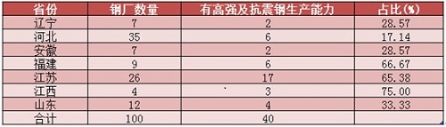 由上表,目前國內(nèi)調(diào)坯軋材型鋼廠共擁有建筑鋼材產(chǎn)線76條,占總數(shù)的14.37%;產(chǎn)能共計(jì)5170萬噸,占總產(chǎn)能的12.98%。相對而言,目前國內(nèi)此類鋼廠建筑鋼材產(chǎn)能和產(chǎn)線均高于電路自供型鋼廠。其中在此類鋼廠中,江蘇省和浙江省均以17條建筑鋼材產(chǎn)線位居榜首,產(chǎn)能分別為1155萬噸和925萬噸。 (二)高強(qiáng)以及抗震鋼生產(chǎn)能力 隨著國家經(jīng)濟(jì)和建筑水平的發(fā)展,對建筑設(shè)施安全性能要求越來越高,在此背景下,高強(qiáng)鋼筋(四級鋼)以及抗震鋼筋應(yīng)運(yùn)而生,且需求有日趨擴(kuò)大之勢。在此次調(diào)查中,我們特別對此類鋼廠此類產(chǎn)品產(chǎn)能產(chǎn)線進(jìn)行了一番梳理。 表10 具備高強(qiáng)以及抗震鋼生產(chǎn)能力鋼廠