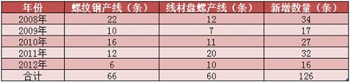 由上表可以看出,目前國內(nèi)具備高強(qiáng)以及抗震鋼生產(chǎn)能力鋼廠主要分布在遼寧、河北、安徽、福建、江蘇、江西和廣東七個(gè)省,占本次統(tǒng)計(jì)設(shè)計(jì)省份的26.92%;共有此類鋼廠40家,占參與本次調(diào)查鋼廠總數(shù)的19.61%。由此可以得出結(jié)論:目前國內(nèi)具備高強(qiáng)以及抗震鋼筋的鋼廠數(shù)量并不多;集中度高,主要分布在為數(shù)不多的幾個(gè)省內(nèi);部分鋼廠并不集中的地區(qū)例如江西具備高強(qiáng)以及抗震鋼生產(chǎn)能力的鋼廠發(fā)展迅速。 四、近年國內(nèi)建筑鋼材產(chǎn)線增長情況 近年來,隨著中國經(jīng)濟(jì)的發(fā)展,城市化率逐步提高,對建筑鋼材的需求與日俱增。在此情況下,國內(nèi)建筑鋼材產(chǎn)線隨之增加。下面讓我們來看看2008年以來國內(nèi)建筑鋼材產(chǎn)線增長情況。 表11 2008年以來國內(nèi)建筑鋼材新增產(chǎn)線