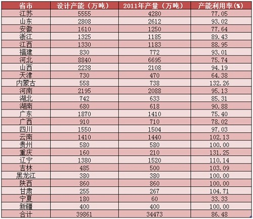 由上表可以看出,2008年以來國內(nèi)新增建筑鋼材產(chǎn)線為126條,占現(xiàn)有產(chǎn)線總數(shù)的23.77%;2008年以來國內(nèi)新增建筑鋼材產(chǎn)能為9140萬噸,占現(xiàn)有總產(chǎn)能的22.93%。短短五年間,國內(nèi)新增產(chǎn)能產(chǎn)線速度為前60年平均速度的近四倍。同時(shí)我們注意到,除去2012年,2008年以來國內(nèi)新增螺紋鋼產(chǎn)能產(chǎn)線有減少之勢,而國內(nèi)新增線材盤螺產(chǎn)能產(chǎn)線則有日趨增加之勢。 表13 2011年各省市產(chǎn)量及產(chǎn)能利用率情況