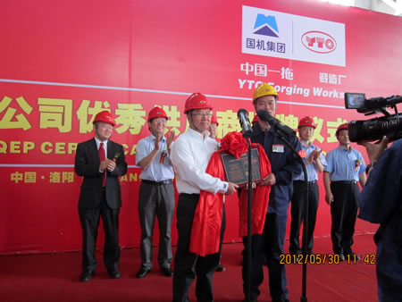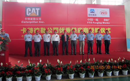 5月30日,在卡特彼勒公司優(yōu)秀供應(yīng)商授牌儀式上,卡特彼勒公司中國/韓國地區(qū)鋼材/鍛件/鑄鋼采購經(jīng)理王呈泉,親手將優(yōu)秀供應(yīng)商銅牌交給一拖鍛造廠卡特產(chǎn)品生產(chǎn)者代表高全亮手中。
