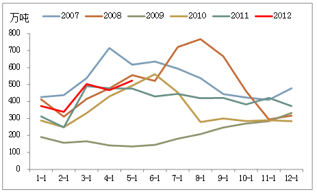 海關總署發布的5月進出口數據顯示,5月鋼材出口523萬噸,較4月份增加56萬噸,年內第二次超過500萬噸,也創下自2010年7月以來的新高水平。與去年同期相比,5月鋼材出口增長9.87%。筆者認為,5月鋼材出口環比激增主要是季節性因素、國內外價差拉大,人民幣匯率等綜合作用的結果。下文將就上述因素作簡要分析。 1、季節性因素使得出口增長符合預期 繼今年3月份鋼材出口環比出現激增之后,5月環比再度大幅增長,并達到523萬噸的峰值,創2010年7月份以來的新高。縱觀2007年至今鋼材出口情況,剔除2009年,受到季節性因素拉動,其余年份5月份的鋼材出口量都處于較高水平。總體而言,二季度處于鋼材傳統消費旺季,鋼材出口呈不斷增長趨勢。因此,從往年鋼材出口情況來看,5月份出口量增長符合預期。 圖表1 2007年至今鋼材出口情況
