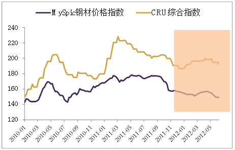 2、國內外價差拉大 受歐債危機進一步惡化、國內宏觀經濟增速放緩及鋼材市場供需失衡等利空因素影響,國內鋼材市場自4月下旬開始了一輪調整,鋼價在5月份加速下跌,已經接近2月份低點。國際市場由于供給持續增加而下游需求未見明顯好轉,5月鋼市整體呈下滑趨勢。 從跌幅來看,截至5月末,國內鋼價月跌幅為3.7%,CRU國際鋼價綜合指數與4月末相比下跌1.9%,國內跌幅明顯大于國際,國內外價差有所拉大。在國內產能過剩及內需不濟的情況下,價差擴大則有力的刺激了對外出口,國內產能過剩略有緩解。但由于出口占比依然較小,出口的大幅增長并不能有效改變產能過剩的局面。 圖表2 Myspic鋼材價格指數與CRU綜合指數走勢