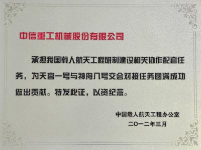 面對(duì)我國(guó)載人航天工程研制建設(shè)協(xié)作配套任務(wù),中信重工機(jī)械股份有限公司以高度的責(zé)任感和使命感,積極組織,認(rèn)真策劃,排除一切障礙,高質(zhì)量按期完成關(guān)鍵配套件生產(chǎn)任務(wù)。 近日,中國(guó)載人航天工程辦公室為中信重工頒發(fā)牌匾,表彰公司為天宮一號(hào)和神舟八號(hào)對(duì)接圓滿成功做出的突出貢獻(xiàn)。