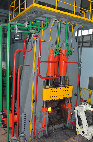 7月9日,國內(nèi)首條40MN預(yù)應(yīng)力鋼絲纏繞多向模鍛壓生產(chǎn)線在中國二十二冶精密鍛造產(chǎn)業(yè)基地投產(chǎn),成功壓制出國內(nèi)首批精密鍛件。此生產(chǎn)線達(dá)到世界先進(jìn)水平,填補(bǔ)了我國這一領(lǐng)域的空白。 利用該多向模鍛技術(shù)鍛造的閥門可一火一次成形,將法蘭一次鍛壓成形,不需要額外的焊接加工,從根本上解決了傳統(tǒng)工藝制造真空閥法蘭焊接的缺陷;同時(shí)閥體帶有成形的內(nèi)孔,大大提高了材料的利用率、減少了后續(xù)加工量,為閥體鍛件的最終用戶節(jié)約了后續(xù)大量的加工工時(shí)。此外,經(jīng)多向模鍛鍛造的閥門,金屬流線比較連續(xù),沒有普通模鍛加工后金屬流線切斷的現(xiàn)象,從而良好地保證了真空閥體的質(zhì)量和機(jī)械性能。生產(chǎn)線預(yù)應(yīng)力鋼絲纏繞和多向模鍛技術(shù)開啟了國內(nèi)生產(chǎn)大型模鍛設(shè)備的先河,達(dá)到世界先進(jìn)水平。 大型模鍛件和重型設(shè)備是目前我國裝備制造業(yè)調(diào)整和振興規(guī)劃中重點(diǎn)支持發(fā)展的產(chǎn)品,也是目前我國最為緊缺的配套產(chǎn)品和技術(shù)裝備。2010年,中冶集團(tuán)及下屬的中國二十二冶集團(tuán)與清華大學(xué)、燕山大學(xué)高校合作,在國內(nèi)首創(chuàng)了以預(yù)應(yīng)力鋼絲纏繞技術(shù)制造大噸位高壓大流量液壓機(jī)。在此基礎(chǔ)上,成功研制出國內(nèi)首臺40MN多向模鍛壓機(jī),并且在短時(shí)間內(nèi)攻克了一大批技術(shù)工藝難題,成功壓制出國內(nèi)首批精密鍛件,其多向模鍛技術(shù)開啟了國內(nèi)生產(chǎn)大型模鍛設(shè)備的先河,達(dá)到世界先進(jìn)水平。 中國二十二冶精密鍛造產(chǎn)業(yè)基地坐落于唐山市高新區(qū),以研發(fā)和生產(chǎn)大型多模鍛造件和重型裝備為主,包括大口徑高溫高壓閥體精密鍛件、石油井口鍛件、模鍛液壓機(jī)等;氐慕ǔ赏懂a(chǎn),標(biāo)志著中國二十二冶集團(tuán)裝備制造的發(fā)展又邁上了一個(gè)新臺階,將改寫我國大型鍛造裝備的歷史,全面帶動(dòng)國內(nèi)閥門行業(yè)技術(shù)進(jìn)步和升級。