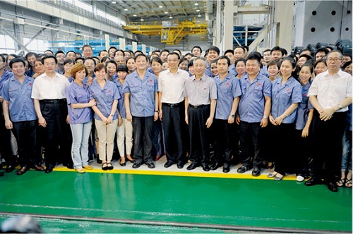 7月13日,中共中央政治局常委、國務院副總理李克強在湖北省委書記李鴻忠、省長王國生,集團公司總經理張國清,湖北省委常委、武漢市委書記阮成發,市長唐良智等的陪同下,到中國兵器工業集團武漢重型機床集團有限公司視察。 下午16時許,李克強一行首先來到武重大件加工廠。作為武重擁有自制設備最多、加工效能最高的產品配套生產單位,這里聚集了武重自主研發的XKD2755(加工長度可達57米)雙龍門四銑頭超重型數控鏜銑床、XKC5680車銑復合加工機床、CKX雙柱16米超重型數控立式銑車床等堪稱世界一流、國內領先的重型裝備,它們不僅成為“武重制造”生產線上的一道道亮麗的風景,也和其他設備一道組成了武重機床“永不閉幕的展覽廳”。武重集團董事長、黨委書記黃照向李克強介紹了武重近來年為國家重點行業和領域制造研發的關鍵裝備。李克強充分肯定了武重集團堅持自主創新所取得的豐碩成果,他還親自來到XKD2755雙龍門四銑頭超重型數控鏜銑床旁,實地查看該設備的加工情況,與生產一線操作者親切交流。當得知該設備以雙龍門四銑頭的設計大大提高了加工效率,且加工精度處于行業前列時,他連連點頭,充分肯定了武重為提升裝備制造水平、加快產業升級所做出的努力。 李克強還來到武重立車公司。該單位的產品以超大、超重、技術成熟等特點享譽海內外,也是當之無愧的中國立車第一品牌。從這里產出了一臺臺獨一無二的極限裝備,包括不久前剛剛拼裝成套的目前世界上最大規格的數控立式車床——CKX53280型超重型數控立車。該設備加工直徑可達28米,其機床重量達1200噸,一舉刷新了由武重保持的立車制造最大規格的世界記錄。李克強邊走邊看,所到之處受到了武重廣大員工的熱忱歡迎。 在考察結束時,李克強發表了重要講話,指出:武重是全國知名企業,有著光榮的傳統,是建國初期156個重點項目之一,現在又浴火重生,從老廠搬到了新廠。這里生產了很多在同行業是亞洲第一,也是世界上最大的產品。武重長了中國裝備工業的志氣,也支撐了中國裝備制造業在關鍵領域的發展,而且武重產品還走向世界,在一些國家立了腳,打開了局面,把中國重型裝備的王牌亮了出去。武重已經成功地進行了二次創業,要再進行第三次創業,成為世界最頂尖的企業,去創造世界一流的業績。 |