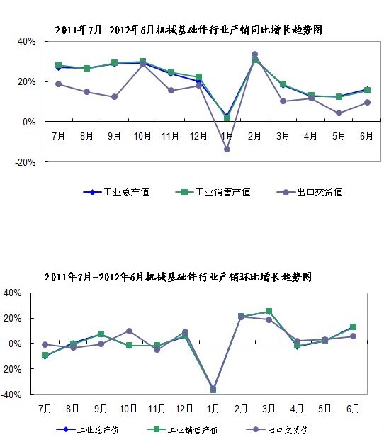 2012年6月,全國機械基礎件行業產銷增速同比略有上升,環比略有上升。