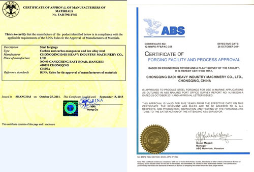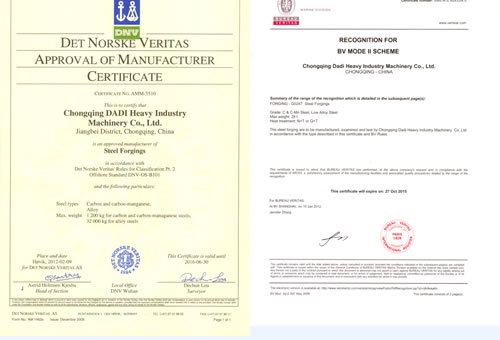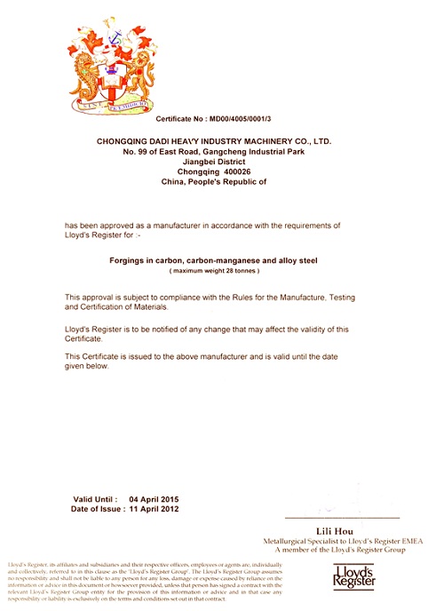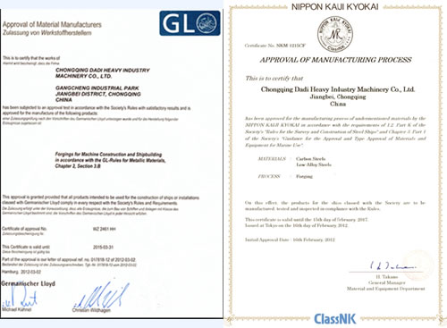 重慶大帝重工機械有限公司于2012年4月11日順利通過英國船級社的認證。 重慶大帝重工機械有限公司倡導并踐行“責任至上·責任為先”的核心文化,始終堅持以質量和安全為生命,注重環(huán)保節(jié)能,大力推行現(xiàn)代化的質量管理體系。2006年7月公司順利通過ISO9001國際質量管理體系認證,2010年復核獲取ISO/TS16949:2009質量管理體系認證,公司已經順利通過中國船級社、美國船級社、意大利船級社、法國船級社、挪威船級社、日本船級社、德國船級社和英國船級社的認證,并已收到韓國船級社認證的通知書,即將獲得韓國船級社的認證證書。