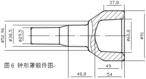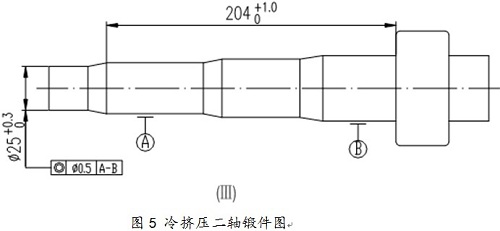 冷鍛溫鍛技術(shù)的應(yīng)用 冷鍛工藝在汽車零件的生產(chǎn)上得到大量應(yīng)用,國(guó)內(nèi)的使用也越來越廣泛,冷鍛工藝適用于中小型鍛件的大批量生產(chǎn),不僅鍛件的外觀形狀得到改善,節(jié)能效果也比較顯著。 ⑴汽車變速箱輸出軸的冷擠壓工藝。該產(chǎn)品如圖5所示。設(shè)計(jì)采用三道冷擠壓成形,材料逐次變形,最終成形。該產(chǎn)品材質(zhì)為16MnCr5G,鍛造生產(chǎn)工序?yàn)椋轰彺蚕铝稀囃鈭A→退火→噴丸→磷皂化→三次擠壓。