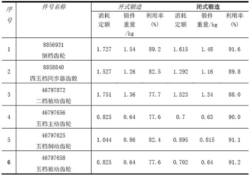 ⑵采用閉式鍛造工藝。閉式鍛造具有材料利用率高、鍛件精度高的特點(diǎn),特別適合于回轉(zhuǎn)體鍛件。南汽鍛造通過對(duì)齒輪鍛件的工藝改進(jìn),在730t摩擦壓力機(jī)上用閉式方式取代原1600t鍛壓機(jī)開式鍛造,表1是改進(jìn)前后,材料利用率的對(duì)比。