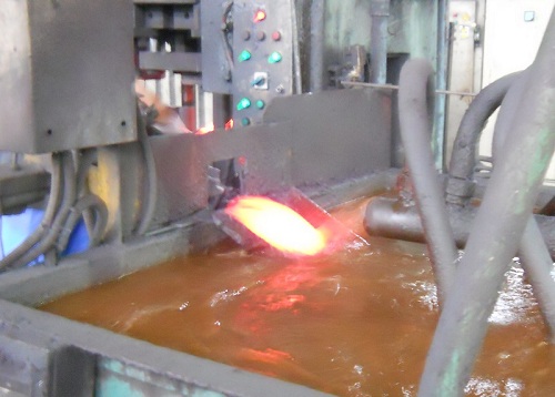該鍛件的材料屬于中碳含硼鋼,原生產(chǎn)工藝為:下料→中頻加熱→鍛造→切邊沖孔→再加熱→淬火→回火。 經(jīng)過(guò)大量試驗(yàn),分別對(duì)中頻加熱節(jié)拍、溫度、始鍛和終鍛溫度,鍛后停留時(shí)間,淬火溫度、介質(zhì)濃度和溫度等各項(xiàng)因素對(duì)淬火質(zhì)量的影響,搜集了大量數(shù)據(jù),在此基礎(chǔ)上,制定了一套合理的工藝規(guī)范,用于大規(guī)模生產(chǎn),產(chǎn)品質(zhì)量完全符合客戶(hù)的要求。新工藝為: 迄今已經(jīng)用該工藝生產(chǎn)了兩千余萬(wàn)件產(chǎn)品。該項(xiàng)目的成功,每年可減少電能消耗1000萬(wàn)千瓦時(shí),生產(chǎn)流程更趨合理,生產(chǎn)周期從15天縮短到4天左右,生產(chǎn)效率提升了20%以上。原計(jì)劃投資4條熱處理調(diào)質(zhì)爐生產(chǎn)線(xiàn),改為添置4條淬火油槽和4臺(tái)回火爐,節(jié)約60%的投資額。取得良好的綜合效益。