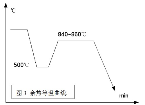 ⑵余熱正火。就汽車(chē)等速傳動(dòng)軸內(nèi)星輪鍛件余熱正火工藝為例。該產(chǎn)品材質(zhì)為含碳量0.53%的碳鋼,產(chǎn)品最終熱處理為滲碳淬火,為了保證良好的切削性能,鍛后要進(jìn)行正火工序。該鍛件產(chǎn)量大,生產(chǎn)節(jié)奏快。用于正火的能耗很高。由于正火溫度較高,氧化嚴(yán)重,氧化皮的噴丸清理時(shí)間也比較長(zhǎng)。我們對(duì)該產(chǎn)品進(jìn)行了余熱正火的工藝改進(jìn),鍛后產(chǎn)品快速冷卻到500℃,完成奧氏體轉(zhuǎn)變,再進(jìn)爐加熱完成正火,如圖3所示。這樣,可以部分利用鍛后余熱,增強(qiáng)了生產(chǎn)連續(xù)性。