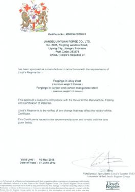 近日,江蘇金源鍛造股份有限公司取得了英國船級社(LR)的認證證書。江蘇金源可以生產符合英國船級社標準的合金鋼鍛件和碳鋼鍛件,最大重量可達12.8噸,該證書有效期至2015年5月16日。