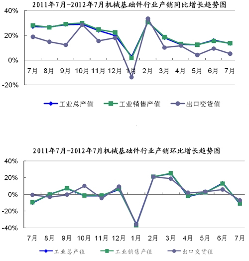 2012年7月,全國機械基礎件行業產銷增速同比、環比略均有下滑。
