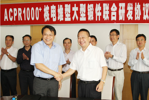 圖為一重董事長吳生富與中廣核工程有限公司總經理束國剛簽署研發協議 為加快我國三代核電自主化建設,共同推進我國具有自主知識產權的先進百萬千瓦級壓水堆核電技術的研制工作,8月15日,中國第一重型機械集團公司與中廣核工程有限公司在一重賓館簽署ACPR1000+核電堆型大型鍛件聯合研發協議。一重董事長吳生富、中廣核工程有限公司總經理束國剛出席簽字儀式并分別致辭。吳生富董事長與束國剛總經理在研發協議上簽字。公司董事會秘書劉長韌主持簽字儀式。 在簽字儀式上,吳生富首先代表中國一重向多年來給予一重大力支持的中廣核工程有限公司表示衷心的感謝。他說,近年來,一重在國家能源局、核安全局以及中廣核工程有限公司等大力支持下,以打造世界一流的核電裝備供應商為目標,在大型鑄鍛件的研發、技術改造等方面投入了大量的人力、物力。目前,一重核電鑄鍛件的制造能力已達到了世界第一的水平,產出量也位居世界前列。一重已全面掌握了“二代加”和“第三代”核電大型鑄鍛件制造技術,取得了壓力容器、蒸發器、穩壓器、主設備重型支撐等核島設備制造資質,形成了年產5臺套百萬千瓦級核島一回路主設備、10套核島一回路設備及5套常規島設備所需大型鑄鍛件的能力。日本福島核事故后,一重進一步完善了核質保體系、技術體系和生產體系,細化了生產過程控制,實現了核電鍛件質量的穩步提高,為我國核電事業發展以及新一代自主核電研制工作奠定了堅實基礎。吳生富表示,促進我國核電事業的不斷發展,是一重的責任。一重一定全力以赴,與中廣核工程有限公司并肩攜手,優質、高效地滿足ACPR1000+核電堆型所需的大型鍛件,共同推進我國具有自主知識產權的三代先進核電技術的研發。 束國剛在致辭中對一重長期以來給予中廣核工程有限公司的支持表示感謝。他說,推進我國具有自主知識產權的三代先進核電技術ACPR1000+的研發工作,僅僅依靠中廣核工程有限公司的力量是不夠的。一重作為我國裝備制造業的領軍企業,作為我國重要的核電生產制造企業之一,通過此次合作、聯合研發、優勢互補,我們一定能夠打造更安全、更經濟、更有競爭力的三代核電技術,進而促使我國核電技術躋身國際先進前列,有力推動我國三代核電裝備自主化。
