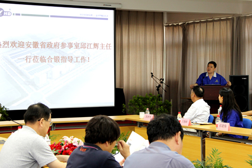 在生產(chǎn)車間,嚴建文董事長向邱江輝主任介紹公司產(chǎn)品 8月24日下午,安徽省政府參事室黨組書記、主任邱江輝一行40余人蒞臨合鍛調(diào)研指導工作。公司董事長嚴建文攜合鍛管理團隊,陪同邱江輝主任一行參觀了合鍛工業(yè)園。 嚴建文董事長對邱江輝主任一行來合鍛調(diào)研指導工作表示熱烈歡迎,并匯報了公司生產(chǎn)經(jīng)營情況。他表示,在各級領導的關心支持下,近幾年合鍛公司承擔了包括4項國家科技重大專項、國家863計劃、國家重點新產(chǎn)品計劃等在內(nèi)的各級科技項目18項;自主開發(fā)各種數(shù)控精密鍛壓機床新產(chǎn)品50余項;形成專利百余項,制修訂國家行業(yè)標準6項;培養(yǎng)了一批學術技術領軍人物。