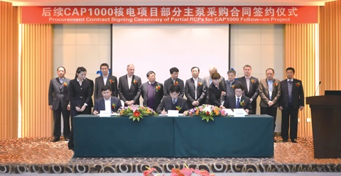 由國家核電工程公司主辦、沈鼓集團承辦的AP1000核電主泵第18次領導層IPT會議,日前在遼寧沈陽舉行。會議期間,國核工程有限公司與沈鼓集團核電公司、哈爾濱電氣動力裝備公司簽訂了“后續CAP1000核電項目部分主泵采購合同”,合同總額超過25億元。此次簽約是CAP1000屏蔽電機主泵國產化的關鍵標志,更是落實國家核電發展戰略的重要舉措。