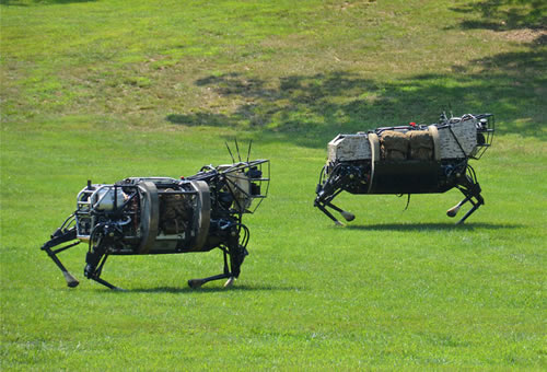 5、這兩只四腿機器人是美國國防部高級研究計劃局(DARPA)有腳給養支持系統項目的一部分,它們正在測試中跑過一片場地。這種半自治的LS3機器被設計成用于攜帶重物穿過崎嶇地帶。