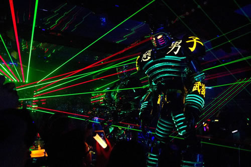 7、在這張2013年10月6日拍攝的照片中,東京機器人餐廳的激光燈照亮了表演中的機器人。