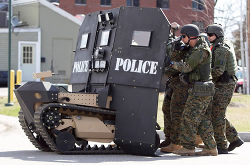 8、SWAT機器人是一種擁有護盾的遠程遙控坦克型車輛。2013年4月18日,這款機器人在緬因州為媒體記者進行演示。研發公司稱,他們的裝置能夠保證人員在面對僵局或者武裝嫌犯時的安全。