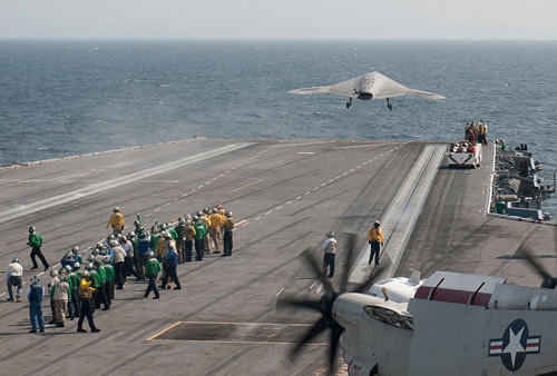 23、一架X-47B無人空戰(zhàn)系統(tǒng)驗(yàn)證機(jī)從布什號核動(dòng)力航母上起飛,這是它首次降落在航母甲板上。這次降落標(biāo)志著首次有無人駕駛飛機(jī)完成海上降落。