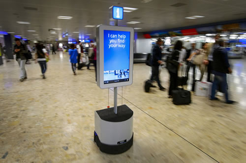 25、2013年6月13日,一個機器人引導乘客穿過日內瓦國際機場的行李領取處。日內瓦機場正在使用自主式機器人來引導旅客前往十幾個目的地,比如ATM機、失物認領處或者廁所等。