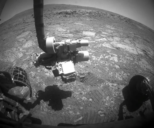 26、這是來自美國宇航局火星漫游者機遇號的前部景觀。自從2004年著陸以來,近10年時間里它穿梭在火星表面并收集著數據。
