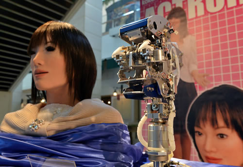 27、2013年2月7日,Kokoro公司在東京的三麗鷗總部展示人形機器人Actroid(左)和它的內部工作中心。
