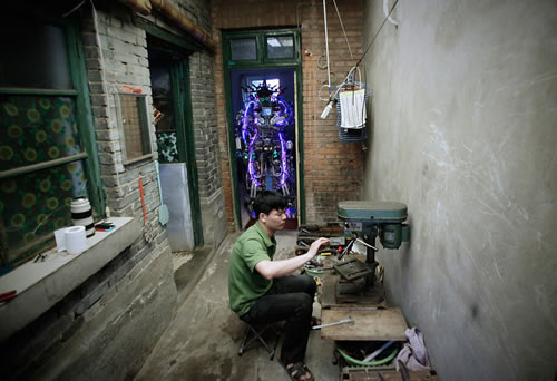 29、2013年5月15日,中國(guó)發(fā)明家陶相禮在他北京的房屋院子為自制機(jī)器人焊接部件。37歲的陶相禮花費(fèi)了約15萬(wàn)元、耗時(shí)11個(gè)月,使用從二手市場(chǎng)購(gòu)買的舊金屬和電線建造出了這個(gè)機(jī)器人。