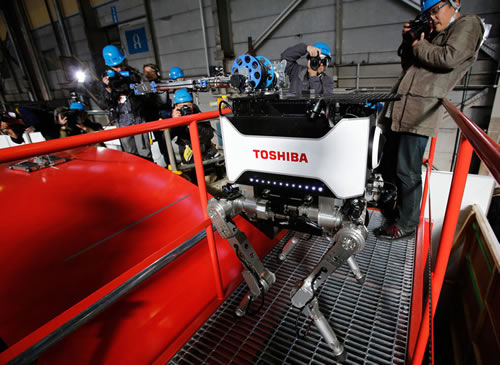 30、2012年11月21日,攝影師為東芝公司的新型四腿機(jī)器人拍照,東芝公司聲稱它能夠?qū)[摧毀的福島核電站進(jìn)行調(diào)研和修復(fù)工作。這款機(jī)器人能夠在崎嶇的表面行走,而且能避開(kāi)障礙物和攀爬樓梯。
