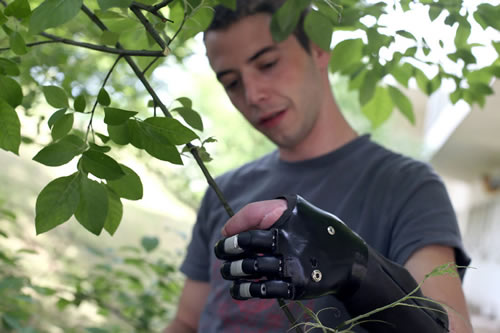 2、2013年6月3日,22歲的法國病人Florian Lopes使用他的新仿生手舉著一根樹枝。Lopes在2011年年末的事故中失去了三根手指,他是第一個接受這種假肢的法國病人。這款價值4.2萬歐元的假肢已經在蘇格蘭和美國使用。