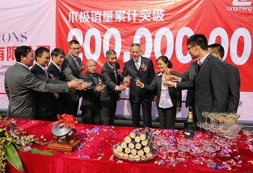 2013年11月13日,江蘇龍城精鍛爪極累計銷量突破2億件慶祝活動在公司籃球場隆重舉行。公司董事長莊龍興、總經理莊建興、常務副總倪可拉、總經理助理莊明等領導以及員工代表200余人,共同出席了慶祝活動。