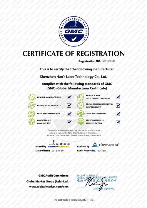 2012年11月,大族激光成功通過德國TUV驗廠,并獲得了“GMC環球優質制造商”認證。 GMC是國內外精英用近15年時間打造出來的優質中國制造標志,一項國際外貿出口實力資格標志,它是在收集分析具有持續采購需求的全球買家意見的基礎上制定的,反映了專業買家的采購習慣以及篩選優質中國制造商的評估標準。認證活動是通過專家的資格審查、實地驗廠、申請報告復核等一系列嚴苛的標準考核和檢驗程序,最終綜合評定產生的。大族激光在制造商生產、研發資質,科技創新能力,工廠規模,專業團隊及經驗,環保、勞工福利,社會環境責任,信譽/商譽及過往OEM/ODM經驗等各項實力指標的考評上完全符合考核標準,均處于行業領先水平。 “GMC環球優質制造商”榮譽的獲得是大族激光不斷加強企業管理,完善產品品質、提高研發實力的必然結果,也表明了環球市場GMC優質制造商聯盟項目組對大族激光綜合實力的充分肯定。加之大族激光全系列激光切割機及數控系統已全部通過歐盟CE認證,為大族激光擴托全球市場奠定了國際品牌基礎。進一步開拓國際市場掃清了障礙。大族激光將力爭實現“高品質、高性價比、高競爭力產品”的目標,以確保每一臺產品的精益求精, 贏得全球用戶的高度信賴和良好口碑。 |