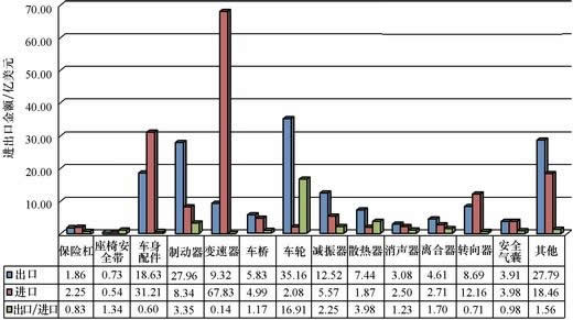 汽車零部件出口現狀 據統計,2012年1~9月,我國汽車零部件出口總金額413.29億美元,同比增長8.69%。其中,發動機出口236.79萬臺,同比下降29.56%,出口金額11.51億美元,同比下降12.51%;汽車零件、附件及車身出口金額207.82億美元,同比增長4.84%;汽車、摩托車輪胎出口金額109.17億美元,同比增長10.94%;其他汽車相關商品出口金額84.79億美元,同比增長20.35%。我國各類汽車零部件進、出口情況如附圖所示。