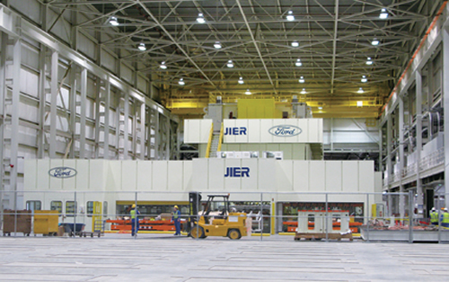 2013年5月24日,濟南二機床為福特汽車堪薩斯工廠提供的沖壓線項目順利通過終驗收,正式投產使用。該項目為整個福特項目首條交貨的沖壓線,從2011年4月簽約,歷經廠內設計制造、海內外長途運輸、指導安裝調試、試生產等各階段,歷時兩年時間畫上了圓滿句號,成為濟二擔任國際總包商、進入海外高端市場著名汽車整機制造廠的首個具有自主知識產權的快速沖壓線項目,開啟了企業發展史上具有里程碑意義的嶄新篇章。 該沖壓生產線自2012年7月開始在美國安裝,今年1月安裝調試完畢后開始試生產。經過5個月的試生產,生產線成功經過了20余套模具、上萬件合格沖壓件的驗證。驗收過程中,福特汽車公司技術人員對生產線的各項參數、性能指標、連鎖動作、安全性、負荷實驗等進行了檢測驗收,最終各項指標全部符合合同要求,用戶滿意。 福特堪薩斯項目是一條雙臂全自動快速沖壓線,由1臺2500噸、1臺1600噸和2臺1000噸多連桿壓力機,以及雙臂送料系統、拆垛機、清洗機、涂油機等設備組成,應用了數控液壓拉伸墊、同步控制、全自動換模、整線防護等多項關鍵技術,生產節拍每分鐘15次,全自動換模時間3分鐘,是代表目前世界最先進水平的沖壓生產線。 濟南二機床承擔的福特項目共有5條大型沖壓生產線,率先完工交付使用的這條沖壓線安裝在堪薩斯城的新建工廠,是該工廠唯一的一條沖壓生產線。其余4條沖壓線正在福特汽車底特律工廠安裝調試,將于2014年1月份全部完工。