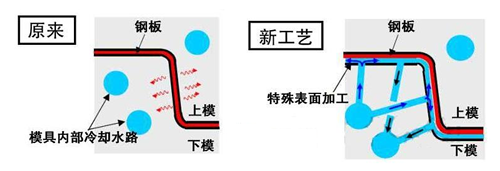 日本優尼沖壓和新日鐵住金2013年5月20日宣布,在利用生產效率高的“直接水冷方式”來量產熱沖壓部件方面取得了成功。 以前是利用模具內部的冷卻水來冷卻,而新工藝直接在模具表面與鋼板之間流過冷卻水,實現急速冷卻。 熱沖壓工藝是在對高溫加熱后的鋼板實施沖壓成型的同時,在模具中急速淬火,由此獲得高強度產品的加工方法。與冷沖壓相比,雖然能夠獲得高強度且高尺寸精度的部件,但存在淬火需要花費一定時間,導致生產效率下降的問題。優尼沖壓和新日鐵住金新開發的“直接水冷方式”是從經過特殊表面加工的模具的沖壓面噴射冷卻水,使冷卻水在成型后的鋼板與模具表面之間流過,從而實現急速冷卻。據介紹,與通過在模具內部流過冷卻水來間接冷卻鋼板的以往方式相比,新方法的生產效率達到了以往的3倍。 在量產時,急速冷卻造成的部件精度偏差成為這種直列水冷方式的一大課題,但憑借優尼沖壓的模具技術,以及兩公司研究出來的對供水和排水路線及水量控制的優化方法,確保了與以往工藝同等的品質和強度。目前已開始利用該工藝為日產汽車量產車身骨架,今后還將擴大該工藝的應用范圍。