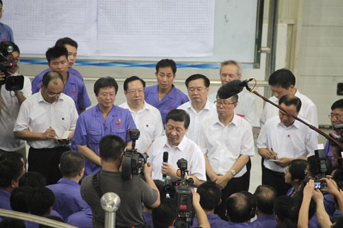 參觀結(jié)束后,習(xí)近平同志發(fā)表重要講話,他表示,武重是有光榮傳統(tǒng)的重型裝備制造企業(yè),經(jīng)過(guò)自我改革,實(shí)現(xiàn)了自身的飛躍,達(dá)到了現(xiàn)在的水平,來(lái)之不易,凝聚著幾代人的心血,給他留下了非常深刻的印象。 習(xí)近平強(qiáng)調(diào),我國(guó)工業(yè)化、信息化、農(nóng)業(yè)現(xiàn)代化處于快速發(fā)展時(shí)期,要實(shí)現(xiàn)兩個(gè)百年目標(biāo),實(shí)現(xiàn)中華民族偉大復(fù)興的中國(guó)夢(mèng),靠的是扎扎實(shí)實(shí)的努力奮斗,靠的是自力更生的精神,靠的是勇?lián)鷼v史重任的勇氣,因此,工業(yè)化之路任重而道遠(yuǎn),希望武重能通過(guò)技術(shù)創(chuàng)新、人才隊(duì)伍建設(shè)、實(shí)現(xiàn)國(guó)內(nèi)外市場(chǎng)占有率的強(qiáng)勁增長(zhǎng),肩負(fù)起振興民族工業(yè)發(fā)展這個(gè)艱巨而光榮的任務(wù),用行動(dòng)書(shū)寫(xiě)武重新的光榮,凝聚工人階級(jí)偉大力量共筑中國(guó)夢(mèng)。 臨別時(shí),武重員工圍攏過(guò)來(lái),向總書(shū)記問(wèn)好,總書(shū)記同現(xiàn)場(chǎng)人員一一握手并與武重干部員工合影留念,祝福大家生活愉快,身體健康,事業(yè)有成,激動(dòng)的員工們熱烈的掌聲和歡呼聲經(jīng)久不息。 中央政治局委員、中央政策研究室主任王滬寧、中央政治局委員、中央書(shū)記處書(shū)記、中央辦公廳主任栗戰(zhàn)書(shū)、湖北省委書(shū)記李鴻忠、省長(zhǎng)王國(guó)生、省委常委、常務(wù)副省長(zhǎng)王曉東、省委常委、武漢市委書(shū)記阮成發(fā)、市長(zhǎng)唐良智等領(lǐng)導(dǎo)陪同考察。 |