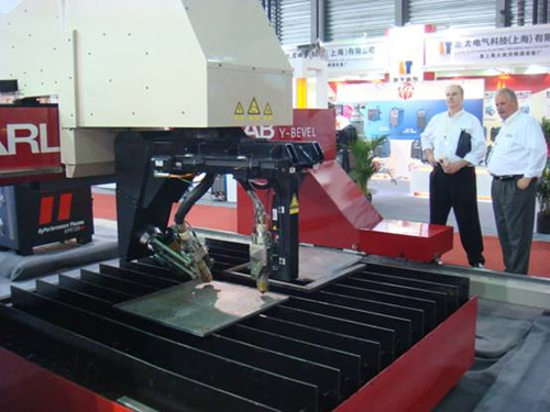 這次展會的另一款明星產品就是最新推出Calibur雙割炬Y型坡口數控等離子切割機。這款切割機著手解決大中幅面不規則Y型坡口零件熱切割變形的問題,鑒于熱脹冷縮特性,板材在熱切割后就會發生變形,對于需要二次或多次切割的異型坡口,兩次切割間的校平、搬運和裝夾往往費時費力,后續切割時的定位找正更難掌握。Calibur革命性的設計理念,最大的特點在于使用兩把等離子割炬同時切割Y型坡口兩個交叉切面,一次運行軌跡即可切割成型。特別適用于造船業、工程機械、農業機械、紡織機械、礦山機械、民用建筑及其它重工業中板材坡口焊接面的加工。國內著名客車制造企業安凱汽車早早就惠購了此款設備。