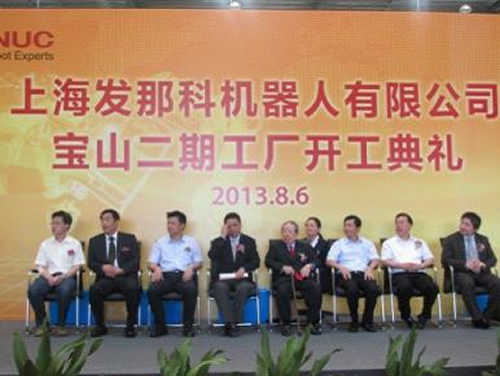 2013年8月6日,上海發那科機器人有限公司的寶山二期工廠開工典禮儀式隆重舉行!發那科株式會社名譽會長稻葉清右衛門先生、發那科株式會社董事所長稻葉清典先生、上海電氣集團總公司董事長徐建國先生、上海電氣國際經濟貿易有限公司總經理陳嘉明先生、寶山區區委常委副書記袁鷹先生、寶山區副區長秦文波先生、以及顧村鎮黨委書記瞿新昌先生、顧村鎮黨委副書記鎮長王槐先生,以及上海機器人產業園、顧村鎮相關領導及寶山區各部委的領導出席了開工儀式,并相繼致辭,共同見證了對上海發那科具有重大意義的歷史時刻的到來!