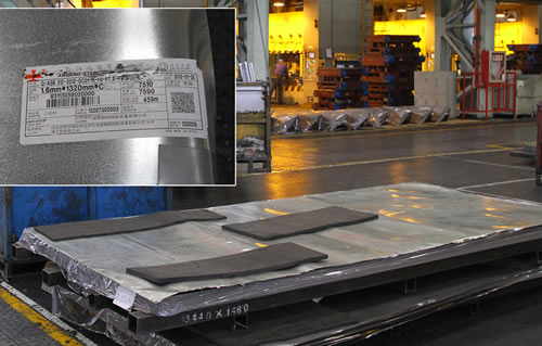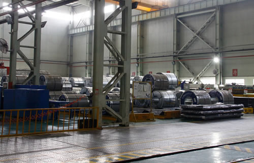 這里是鋼板原材料的堆放區(qū),主要以冷軋鋼卷為主。據(jù)介紹,鋼板主要來源于鞍鋼,最大抗拉強(qiáng)度為700MPa。