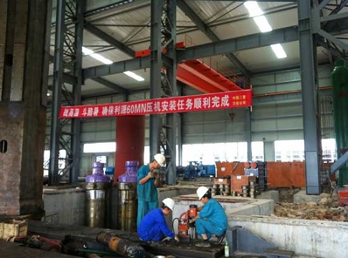 8月14日,按照計劃工作節(jié)點,是利源60MN水壓機項目立柱吊裝的時間。稍有一些常識的人知道,水壓機安裝中最為重要和關(guān)鍵的環(huán)節(jié)之一就是立柱的吊裝。盡管參戰(zhàn)的人員曾經(jīng)多次出色地完成過各類水壓機立柱的吊裝任務(wù),但此次吊裝,他們不敢有絲毫的大意,因為本次吊裝面臨著以往不曾遇到的困難—— 困難一:行車面臨超負荷使用。由于單件立柱和兩根拉桿合計重量為118噸,而車間只有兩臺100噸行車,因此在立柱最終提升的過程中現(xiàn)場只能利用一臺100噸的行車吊裝118噸的立柱,行車超負荷18%,盡管滿足不大于125%的極限使用條件,但由于超負荷使用,存在著一定的不確定性。因此,在立柱吊裝前,現(xiàn)場起重人員必須利用立柱對行車的起吊能力進行試驗,以確保萬無一失。 困難二:行車操作人員缺乏經(jīng)驗。在立柱吊裝過程中,行車工與起重工之間的協(xié)同配合至關(guān)重要。在立柱由水平放置到最終豎直的過程中,必須由兩臺100噸行車共同協(xié)作完成。即:兩臺一起抬著立柱的行車必須在起重工的指揮下一臺緩慢上升的同時另一臺緩慢下降,最終垂直豎立于基礎(chǔ)坑中。由于該公司兩名行車工都是駕駛行車不到兩個月的新手,因此,在起吊立柱之前,必須由經(jīng)驗豐富的起重工對兩臺行車的操作人員進行同步運行的多次培訓(xùn),以確保配合默契。 困難三:行車的起吊高度嚴(yán)重不夠。行車軌高18米,立柱連同拉桿的高度達到17.55米。根據(jù)理論測算,拆掉行車鉤頭,采用專用的起吊工裝,起吊高度能夠增加400mm。為了驗證理論的計算結(jié)果在實際過程中能夠達到,必須通過實際測量行車起吊塑料軟繩的長度間接得出行車的最大起吊高度。