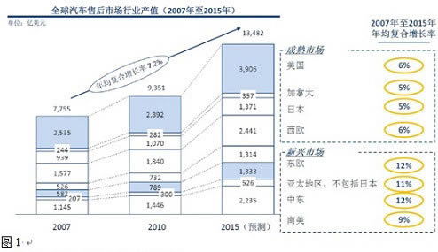 2013年,中國新車銷量突破2000萬輛大關,新車銷售將繼續推動汽車零配件的需求。隨著過保汽車數量的不斷增加,獨立售后市場即將開始大幅增長。與此同時,二手車逐漸被首次購車一族所接受;政府正在加大對行業銷售網絡的監管力度。這些將對獨立售后市場起到積極的作用。 在這些強勁的基礎上,中國汽車零配件制造業預計在未來五年里實現每年20%以上的增長。盡管前景依然樂觀,但中國政府卻已經發現產能過剩是整個行業面臨的一個潛在威脅并從2012年年初就將其列入觀察對象。假冒偽劣現象隨著市場的擴大而增多并將繼續威脅制造商的利潤,這需要零配件制造商執行嚴格的知識產權保護措施。對于國內零配件制造商而言,產品出口依然面臨挑戰,主要原因是缺乏技術開發實力,出口高附加值產品方面能力不足。而人工成本上升和人民幣預期升值帶來的持續壓力,也將繼續令廉價零配件出口商面臨重重挑戰。 汽車零配件需求驅動力 全球汽車售后市場行業產值從2007年的7755億美元增至2010年的9351億美元,預測2015年將達到13482億美元(見圖1),年均復合增長率達到7.2%。按照目前的預測,成熟市場2007~2015年年均復合增長率以美國和西歐為最高,將達6%;加拿大和日本將達5%。新興市場2007~2015年年均復合增長率以東歐和中東為最高,將達12%;亞太地區(不包括日本)將達11%;南美將達9%。
