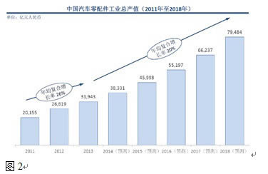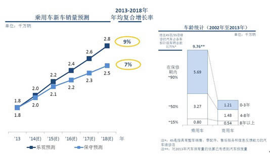 在新車需求繼續推動乘用車銷量的同時,售后市場將會成為零配件行業新的增長引擎。保守預測,中國乘用車2013~2018年的年均復合增長率將達7%,新車銷量到2018年將達2500萬輛。而在國內2002~2013年的汽車保有量中,0~3年車齡的乘用車達到了5690萬輛,其中約有90%的車輛在保修期內。