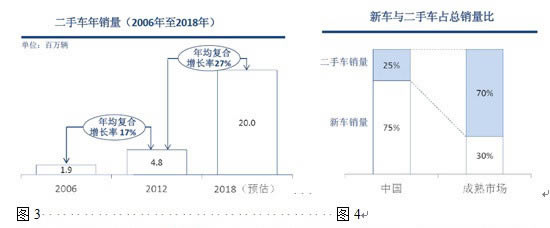隨著中國二手車市場的發展,獨立售后市場零配件的需求將呈增長勢頭。中國消費者一般在首次購車后4~6年內換車。中國新車銷售在2008~2012年之間的飛躍將極大提高未來幾年二手車的市場供應。中國目前的汽車保有量已超過1億輛,預計市場成熟時上升至3億輛,這表明該行業具有巨大的增長潛力。中國2006~2012年二手車銷量的年均復合增長率達到了17%;預計2012~2018年的年均復合增長率將達27%(見圖3)。與成熟市場[iv]相比,根據目前新車與二手車的比例,中國市場尚處于發展初期,零配件行業的發展具有充足的空間。目前國內新車與二手車銷量占比(見圖4)。