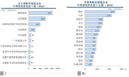 中國目前的二手車市場區域發展不均衡,以2012年的數據為例,北京、上海、廣東、四川、浙江和山東五省二手車銷量占到全國總量的54.3%,其中以廣東省為最高,達到79.8萬輛。乘用車在全國不同地區滲透率的巨大落差,在各區域乃至全國范圍內都為汽車零配件制造商提供了廣泛的機會。 零配件制造行業現狀 中國汽車零配件行業主要集中在東北、河北(含北京)、江浙、兩廣、湖南和四川(含重慶)六大地區,大多數零配件供應商坐鎮關鍵市場。就地域集中度而言,汽車零配件的布局接近汽車整車制造行業。華東地區是汽車零配件和整車制造行業的最大產業集群地,占汽車零配件行業39%,整車制造行業37%。汽車零配件公司正在西部地區擴大生產和銷售規模,與整車生產行業的趨勢相同。其中外商投資企業的平均產值遠高于本土企業。從行業產值角度來看,金屬加工(金屬零配件)是主要細分行業,約占行業總產值的76%,其中括底盤系統(包括傳動、轉向、制動、驅動)約占49%、車身金屬零配件約占9%,發動機系統[v]約占18%。盡管本土領軍企業的主導地位已形成,但跨國企業的市場份額不容小覷。中國本土零配件制造企業2012年國內營收排名前十強(見圖5),外資零配件制造企業在中國營收排名前十五強(見圖6)。