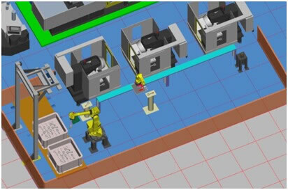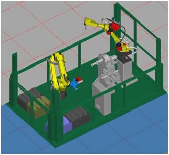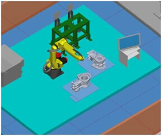 圖2:連桿自動化加工線仿真圖 機器人智能去毛刺 機器人M-10iA根據FANUC離線編程軟件ROBOGUIDE指定去毛刺的部位,憑借FANUC iRVision視覺技術,檢測出實際工件的邊緣特征,通過位置偏移和形狀補償,自動生成機器人去毛刺的軌跡路徑,可輕松應對多個加工面的工件,多種工件的去毛刺需求。通過力傳感器來調整接觸力,不再需要復雜的彈簧按壓機構。